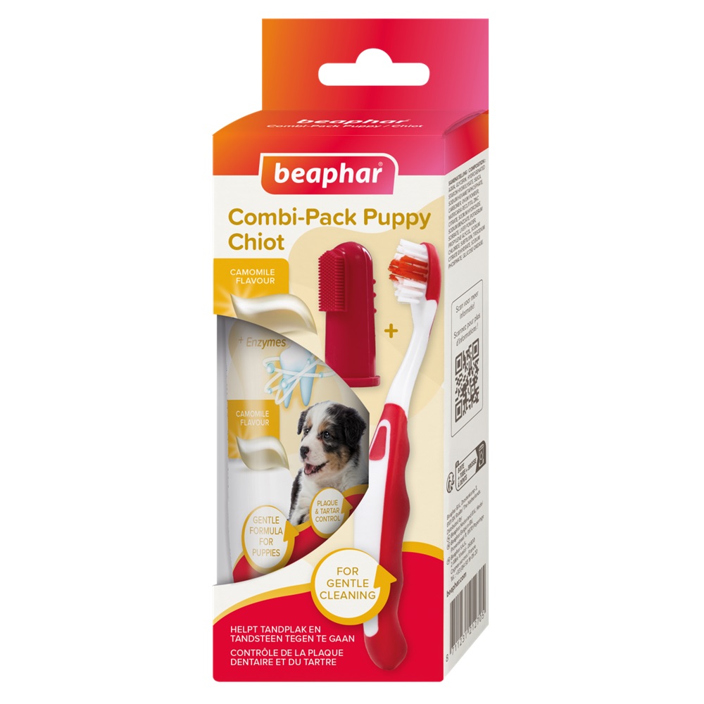 Met een pup in huis heb je al genoeg te doen (sokken redden, schoenen tellen, dat werk). Dan is het wel zo handig als tandenpoetsen gewoon simpel kan. De Beaphar combi-pack puppy tandpasta en borstel helpt je pup rustig wennen aan gebitsverzorging, met een milde puppy-tandpasta en twee soorten borstels.