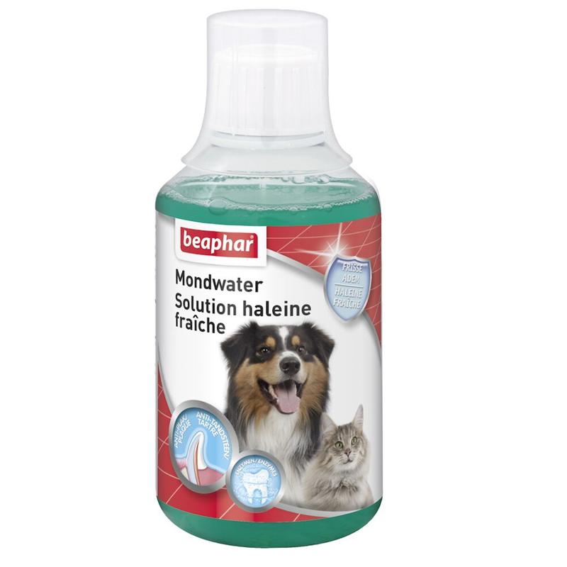 Mondwater gaat de vorming van tandplak tegen bij hond en kat en zorgt voor een frisse adem. Bacteriën en voedselresten vormen tandplak wat resulteert in tand- en tandvleesproblemen en uiteindelijk in een slechte adem. Door de enzymen in het Mondwater worden slechte bacteriën aangepakt om zo de vorming van tandplak te verminderen. Met één flesje Mondwater kunt u 25 liter drinkwater aanmaken wat door het handige doseerdopje extra gebruiksvriendelijk is. Doordat het Mondwater alleen toegevoegd hoeft te worden aan het drinkwater is het uiterst geschikt voor honden en katten die rechtstreekse tandverzorging met bijvoorbeeld tandpasta in de bek (nog) niet toelaten.