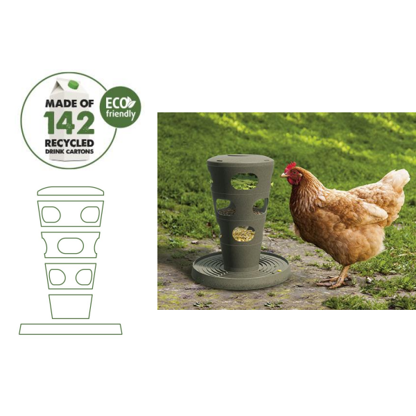 Met deze voertoren geef je jouw kip extra plezier in de ren of het hok. Met deze voertoren kun je jouw kip voorzien van kippenvoer, maar bijvoorbeeld ook met andere snacks, zoals sla. Deze voertoren bestaat uit drie lagen met gaten, die je eenvoudig in elkaar draait. Deze lagen kunnen vervolgens worden gevuld met lekkers. De toren is te vullen door de gaten aan de zijkant, maar ook