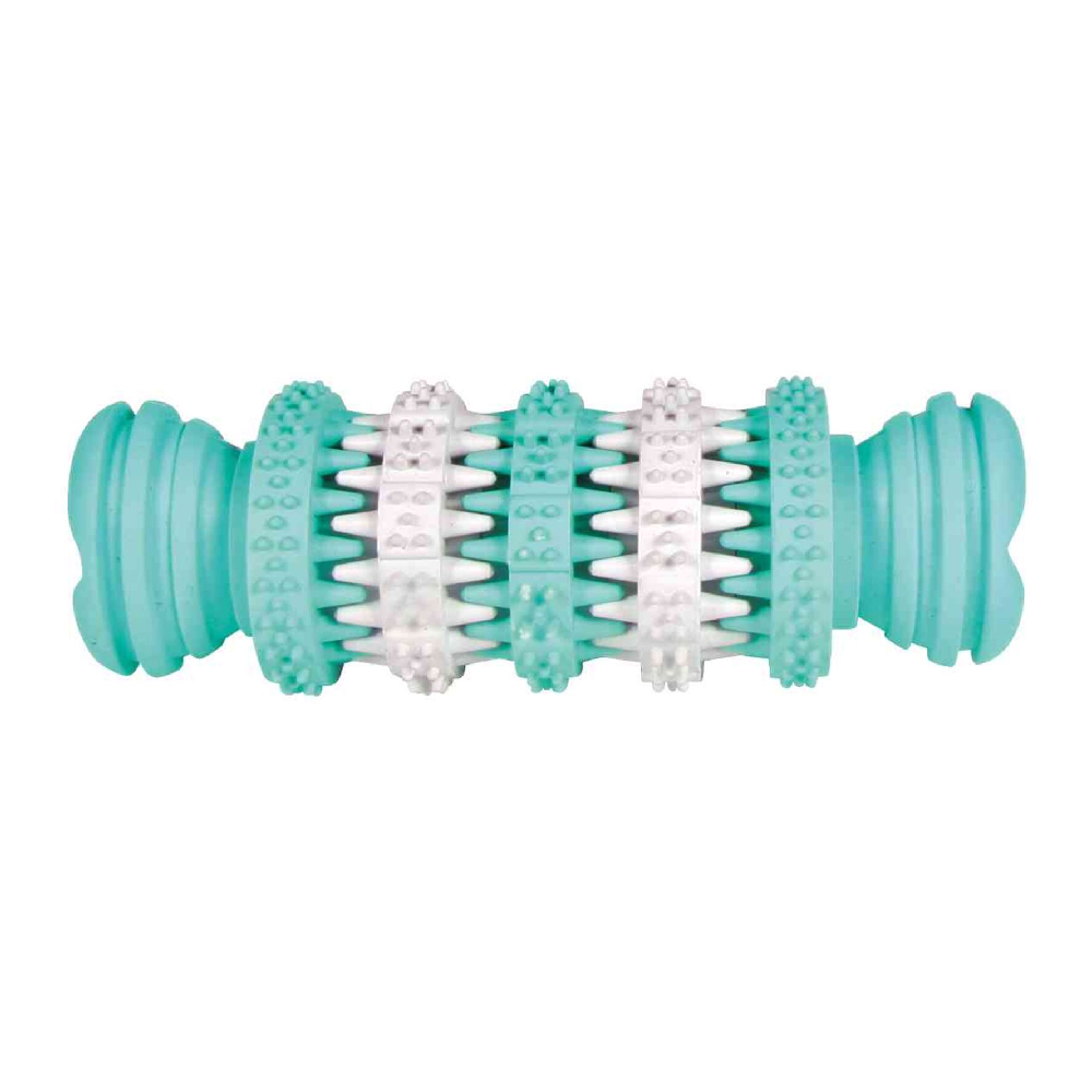 De Denta Fun Bot van 11 cm is gemaakt van natuurrubber en ontworpen om de mondgezondheid van je hond te bevorderen. Het speeltje heeft een muntsmaak, wat niet alleen zorgt voor een frisse adem, maar ook het kauwen extra aantrekkelijk maakt. Het helpt bij het masseren van het tandvlees, waardoor het gebit van je hond op een natuurlijke manier gereinigd wordt. Dit speeltje is ideaal voor het bevorderen van een gezonde mondhygiëne, terwijl je hond zich vermaakt.