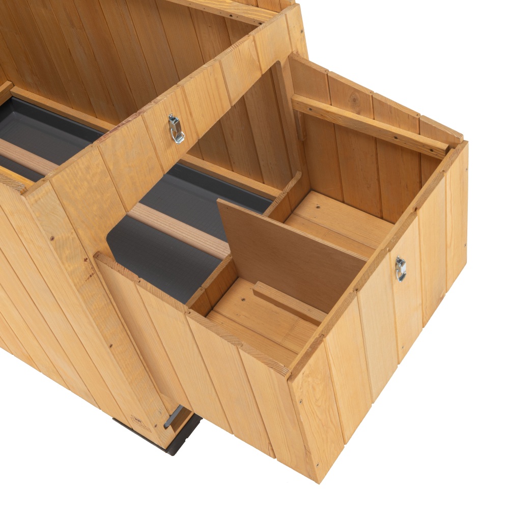 Wat ’m handig maakt: het hok heeft een openklapbaar dak, een uitneembare lade voor makkelijker schoonmaken en een aparte leg-/eierruimte naast het hoofdverblijf. De deur aan de voorkant doet meteen dienst als loopplank, en dankzij de kunststof poten staat het hok iets van de grond af voor extra isolatie.