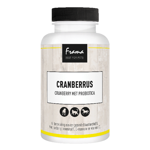 Frama Cranberrus cranberry capsules voor hond, kat en paard zijn speciaal ontwikkeld om de blaasfunctie op een natuurlijke manier te ondersteunen. Dankzij een unieke combinatie van cranberry, berendruif, D-mannose, vitamine C en probiotica kan dit supplement bijdragen aan het behoud van een gezonde urinewegen bij jouw dier.