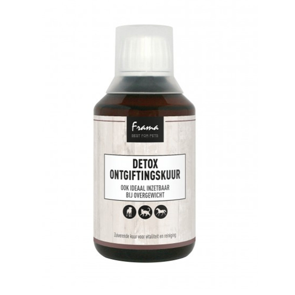 Zuiverende kuur voor vitaliteit en reiniging. Soms wil je gewoon een makkelijk te doseren kuurproduct in huis hebben, zonder poeders, schepjes en geknoei. Frama Schoon / Detox Ontgiftingskuur 250ml is een vloeibare kuur die je door het drinkwater kunt mengen of over het voer kunt geven. Met het bijgeleverde maatbekertje weet je precies wat je doet. 🙂