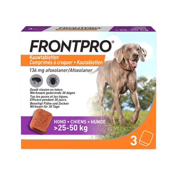 Deze kauwtabletten van Frontpro zijn zeer smakelijk en beschermen snel tegen vlooien en teken. De hond zal de kauwtablet gemakkelijk op eten, dit voorkomt de eeuwen oude strijd.