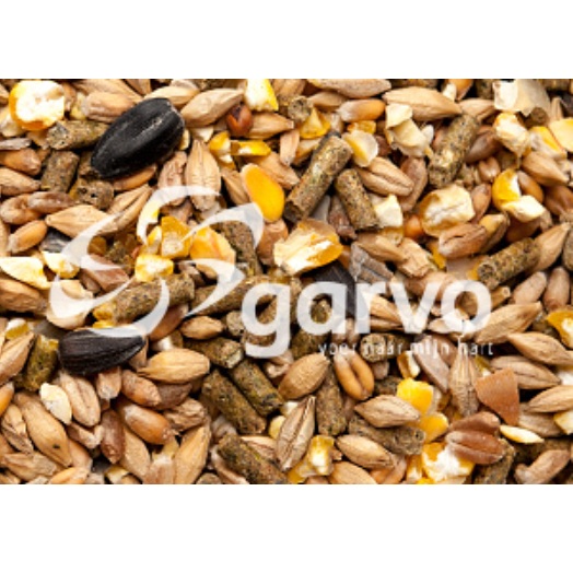 - Samenstelling (o.a.): gerst, maïsgrutten, tarwe, maïsglutenvoer, schelpengrit, sojaschroot (geschild/getoast), raapzaadschroot, kalksteentjes, luzerne, dari rood, zonnepit zwart, rietmelasse, soja-olie