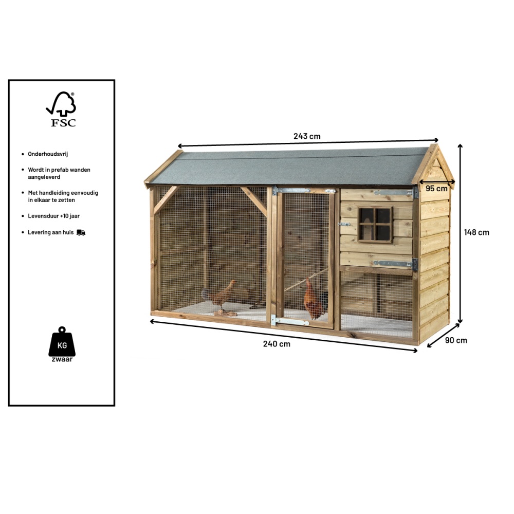 Wil je je kippen een comfortabel en ruim verblijf geven? Dan is het Glorenza Kippenhok Kiki 243x95x148 cm een uitstekende keuze. Dit handgemaakte kippenhok combineert een ruim nachthok met een grote, overdekte scharrelruimte. Zo kunnen je kippen veilig rusten én lekker rondlopen – zelfs als het weer wat minder is.