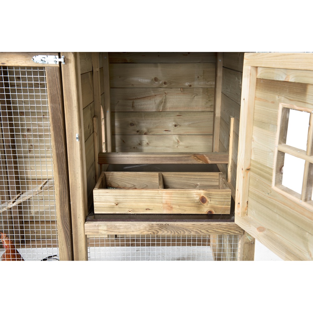 De kippenren is overdekt met een karakteristiek spits dak met dakleer, waardoor je kippen ook tijdens regenachtige dagen droog kunnen scharrelen. En dankzij de duurzame materialen heb je zelf nauwelijks onderhoud.