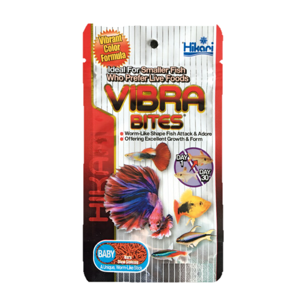 Vibra Bites Baby is een kleinere uitvoering van de normale Vibra Bites met dezelfde unieke eigenschappen, speciaal voor kleinere vissen zoals Tetra, Guppy, Platy en Betta. Hikari Vibra Bites is een uniek voer wat ontworpen is om de vorm en beweging van levende rode muggenlarven na te bootsen. Het langzaam zinkende voer beweegt door de stroming in het water, zoals levend voer ook zou doen. Dit lokt een eet-reactie uit bij de meeste vissen, die zijn gek op dit soort voer. Hikari Vibra Bites zorgt voor uitzonderlijk briljante en levendige kleuren. Door de wetenschappelijke en bijzonder voedzame samenstelling zijn de groei en kleurverbetering van de vissen al binnen één maand zichtbaar.