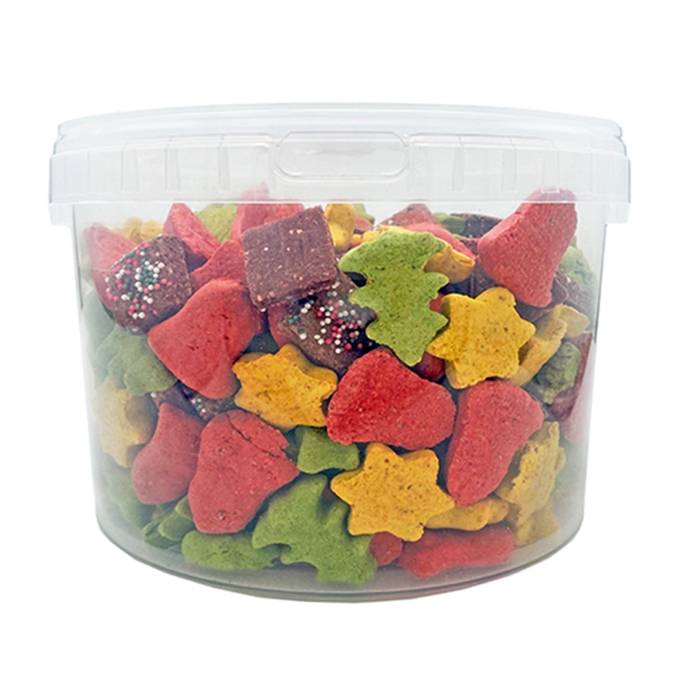 Ook honden mogen meeproeven van de feeststemming! Deze vrolijk gekleurde Kerstkoekjes zijn de perfecte traktatie tijdens de feestdagen. In elke emmer van 1,3 kg vind je een gezellige mix van koekjes in allerlei vormen en kleuren – net zo feestelijk als de kerstboom zelf.
