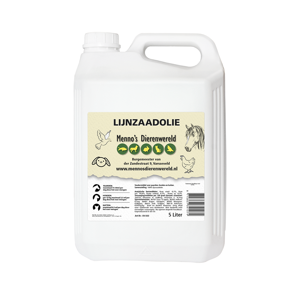Lijnzaadolie 5 liter is een natuurlijke, plantaardige olie van hoge kwaliteit, geschikt voor honden, katten en paarden. Deze olie bevat een hoog gehalte aan onverzadigde vetzuren zoals Omega 3 en Omega 6, die belangrijk zijn voor een gezonde stofwisseling, een glanzende vacht, soepele gewrichten en een sterk immuunsysteem.