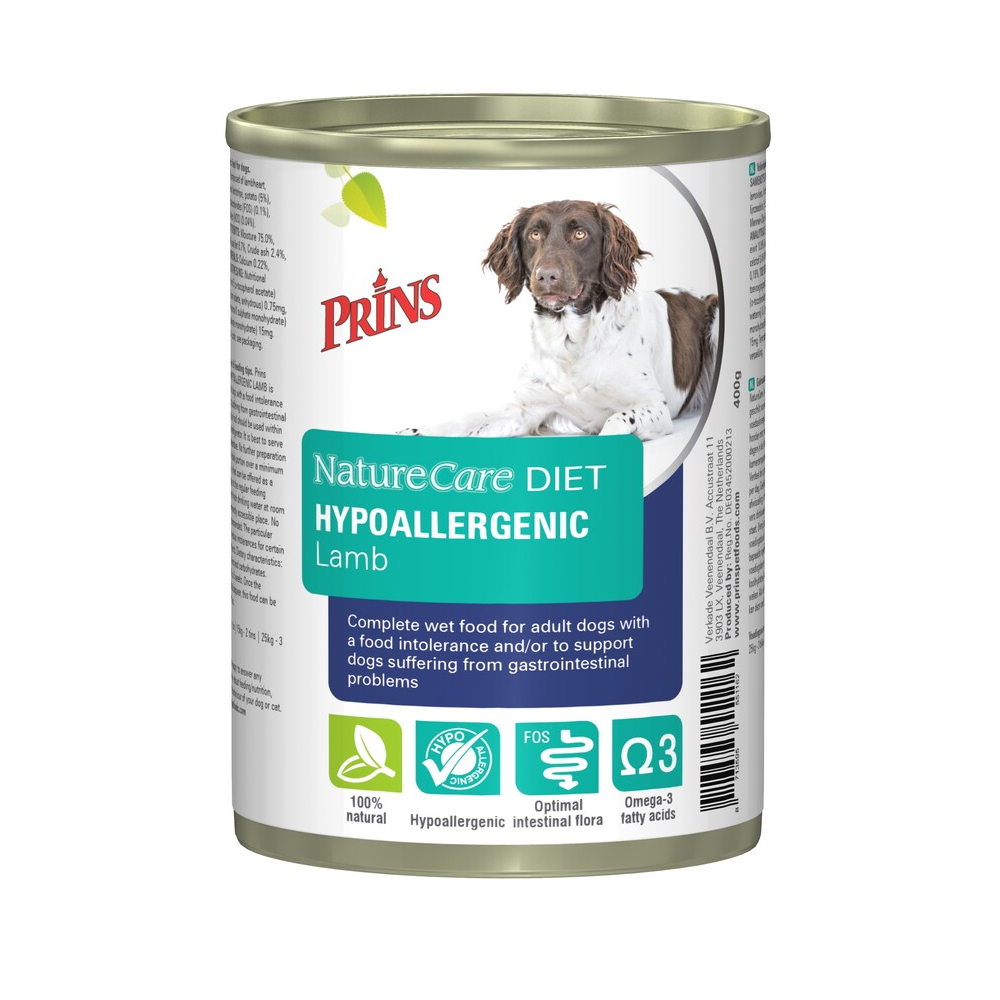 Prins NatureCare Diet Dog Hypoallergenic lamb is een natvoeding speciaal voor honden met huid en vachtproblemen door een voedselovergevoeligheid. Daarnaast is het ook ter ondersteuning van maagdarmproblemen. Deze speciale dieetvoeding is ontwikkeld in samenwerking met dierenartsen en bevat slechts één eiwitbron en één koolhydratenbron zodat de kans op overgevoeligheidsreactie vermindert.