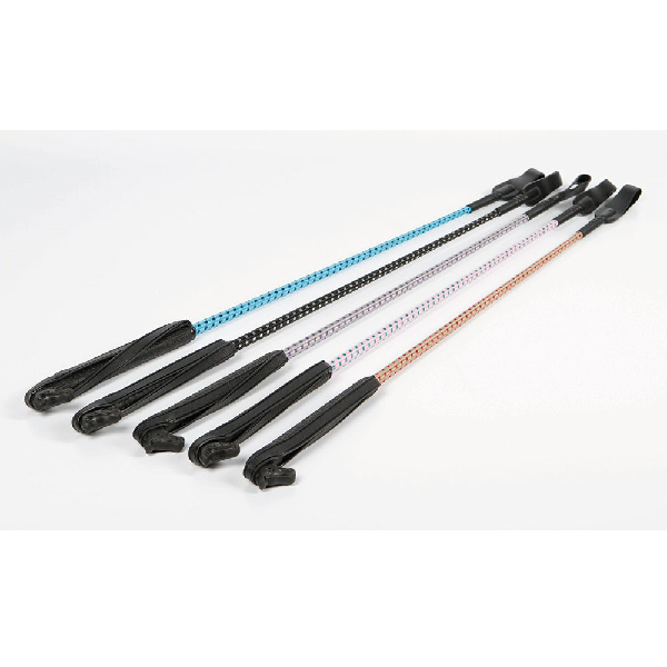 Rubber handvat met paardenhoofd en polslus, nylon gevlochten steel en flapper aan het uiteinde.