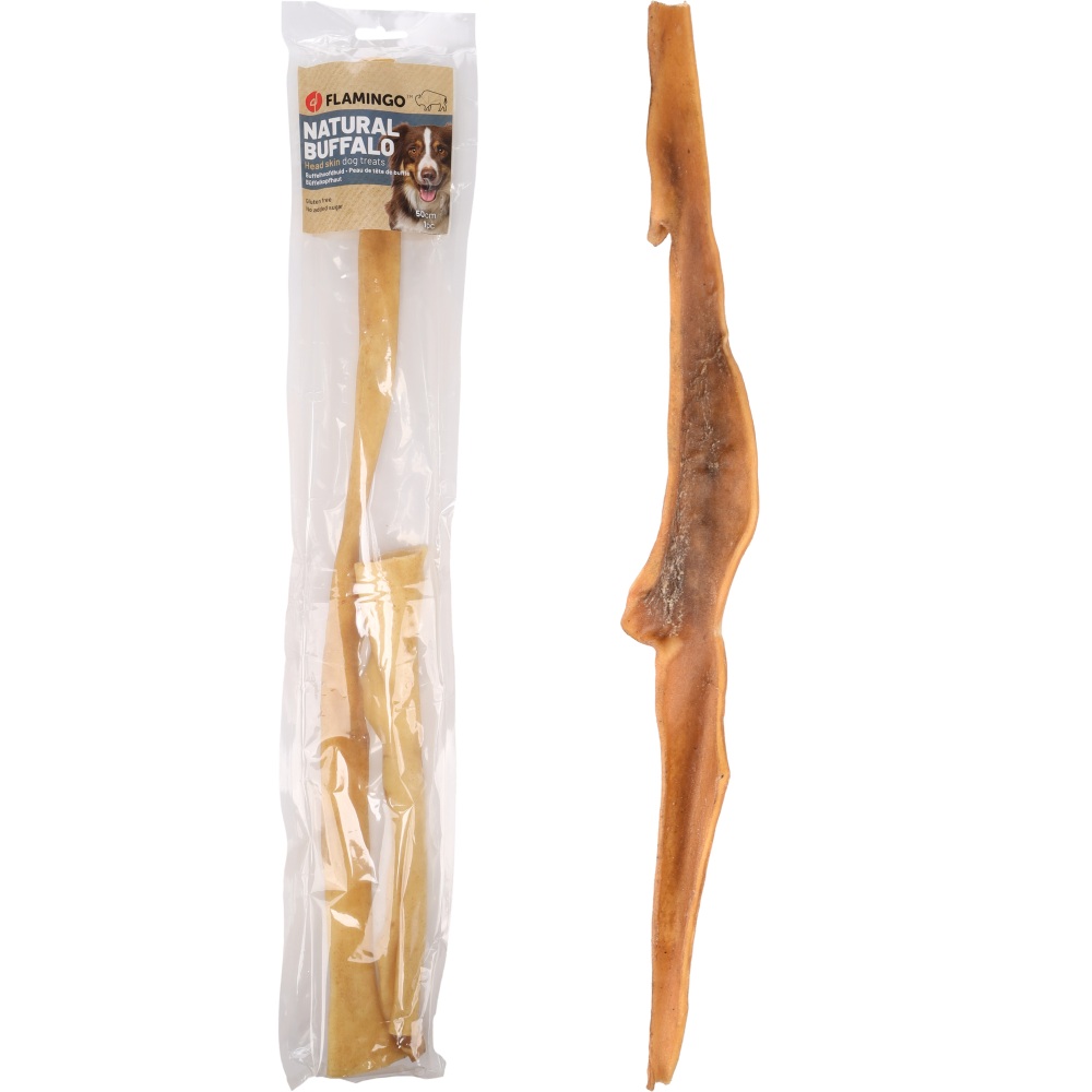 Netjes en simpel: deze runderkophuid is glutenvrij, bevat geen toegevoegde suikers en is zonder kleurstoffen of bewaarmiddelen. Omdat het een natuurlijk product is, kunnen afmetingen en het gewicht per stuk wat variëren. De ene strip is net wat dikker dan de ander — hoort erbij.