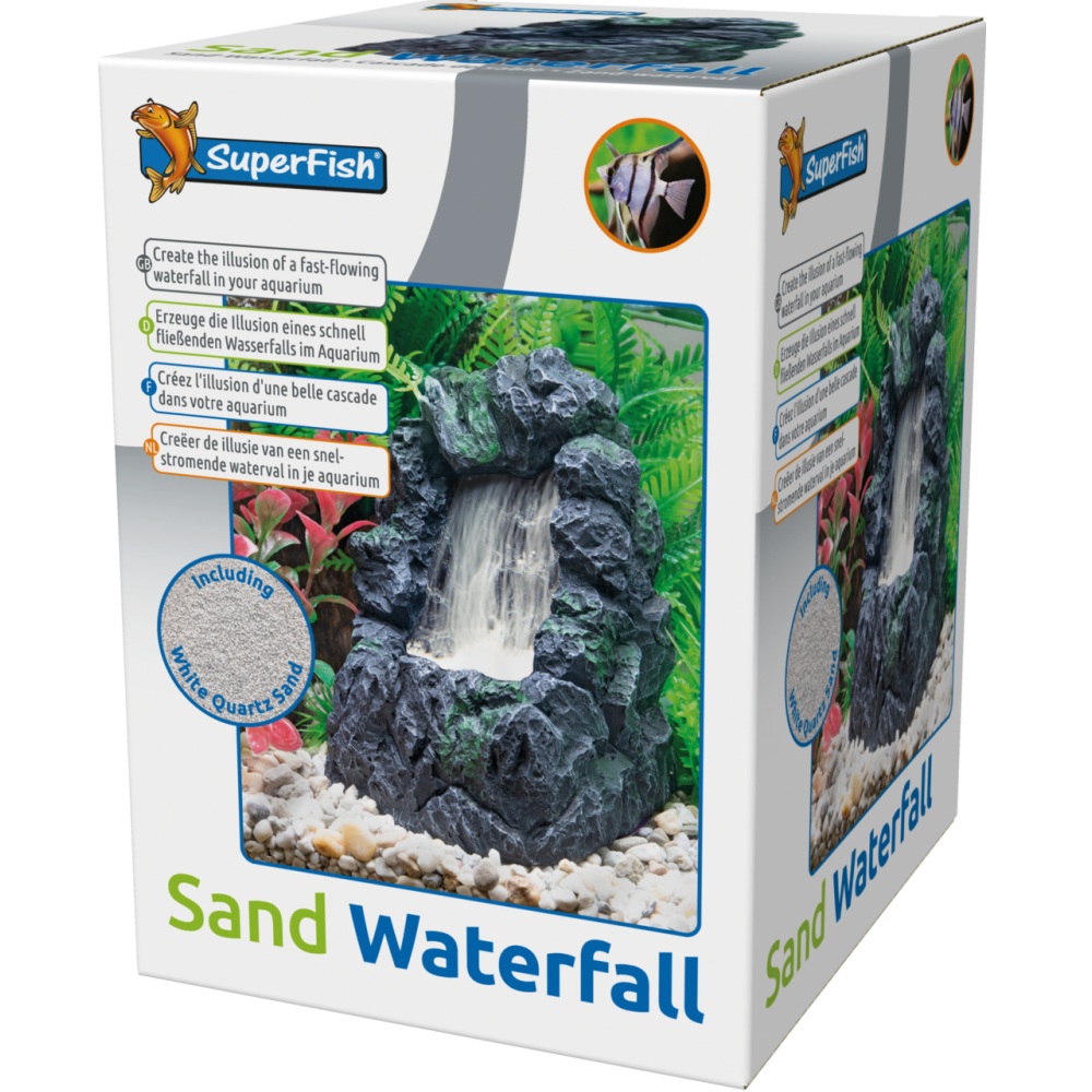 Met de meegeleverde 200 gram zand creëer je die stromende illusie dankzij de venturi-werking van een circulatiepomp (niet inbegrepen). Het zand wordt onzichtbaar omhoog geblazen en valt daarna in een sierlijke stroom naar beneden. Zo lijkt het net alsof je vissen een miniwaterval in de woonkamer hebben!