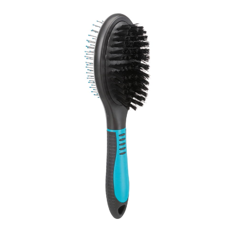 Het kunststof handvat met rubberen coating biedt een comfortabele grip tijdens het gebruik, waardoor het borstelen een aangename ervaring wordt voor zowel jou als jouw huisdier. Geef jouw huisdier de verzorging die het verdient met onze dubbelzijdige borstel – de ideale tool voor een gezonde en glanzende vacht.