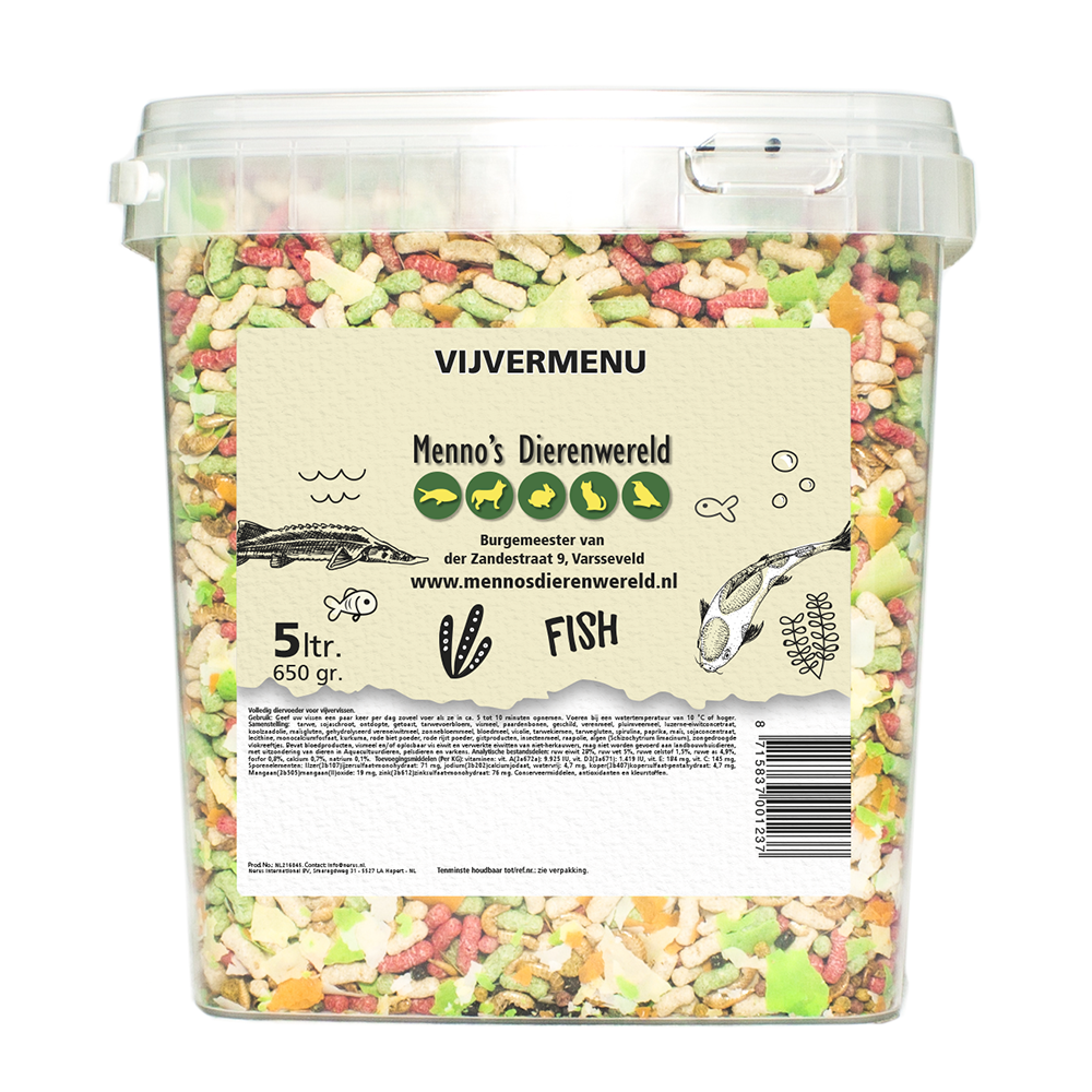 Het Vijvermenu 5 liter is een veelzijdige en uitgebalanceerde mix van verschillende soorten vijvervoer, speciaal samengesteld voor een gezonde en gevarieerde voeding van alle vijvervissen. Deze complete samenstelling bevat: