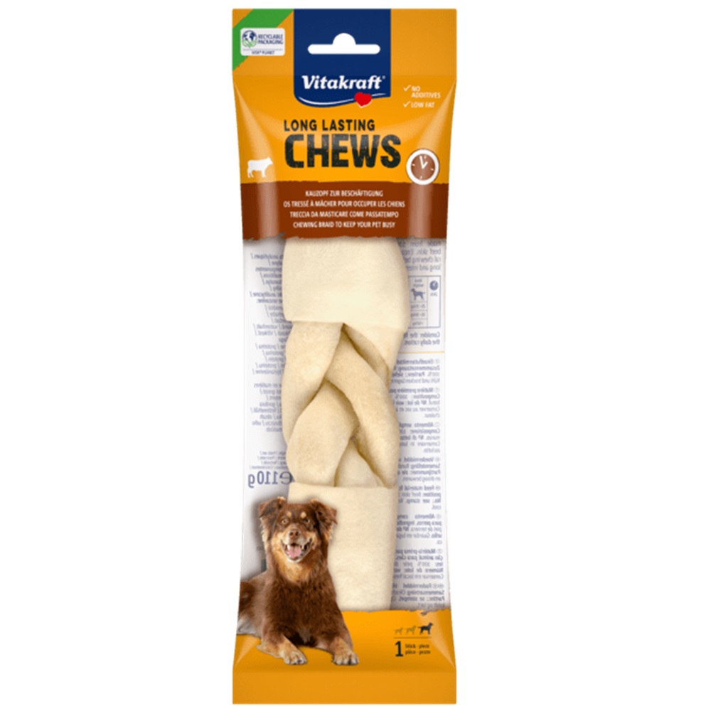 De Vitakraft Buffelhuid vlecht 35 cm is het ideale kauwbot voor honden die graag lang en intensief kauwen. Dit gevlochten bot is gemaakt van 100% gedroogde runderhuid en speelt perfect in op de natuurlijke kauwbehoefte van jouw viervoeter. Het stevige en taaie materiaal zorgt voor urenlang kauwplezier en voorkomt dat je hond zich gaat uitleven op meubels of schoenen.