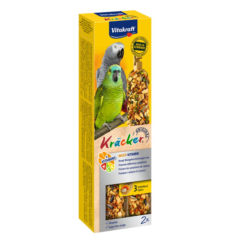 De functionele Vitakraft Kräckers zijn een verantwoorde lekkernij en bevatten lekkere zaden en granen op een natuurlijk knabbelhoutje met houten clip. Deze functionele Kräcker bevat extra vitamine A, C en E die tekorten voorkomen en het immuunsysteem van de papegaai ondersteunen. De Kräckers zijn lekker van smaak en 3-voudig gebakken waardoor de ingrediënten stevig vastzitten en de papegaai actief bezig is zoals dit in de vrije natuur ook gebeurt. Dit zorgt ervoor dat de snavel van de papegaai op natuurlijke wijze afslijt. De Kräckers zijn afgestemd op de voedingsbehoefte van de vogel. De Kräckers bevatten waardevolle vitamines, zijn bereid volgens een suikervrije receptuur en zijn gemakkelijk in de kooi op te hangen door de cliphouder aan de Kräcker.