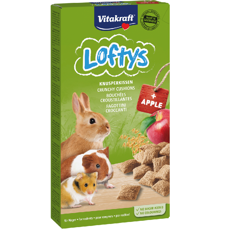 Is jouw knaagdier of konijn ook zo’n vreetzak en komt hij altijd aangehuppeld wanneer je iets lekkers uit de voorraadkast pakt? Verwen je knabbelkont dan met Vitakraft Loftys. Het zijn lekkere, krokante knabbelkussentjes die jouw vreetzak gegarandeerd lekker gaat vinden. Deze Vitakraft knaagdiersnack bevat waardevolle haver en heerlijke appel. De snack is geschikt voor alle knaagdieren en konijnen. Loftys is bereid zonder toegevoegde suikers, conserveringsmiddelen, kunstmatige kleurstoffen en smaakversterkers. Dat wordt dus lekker knabbelen!