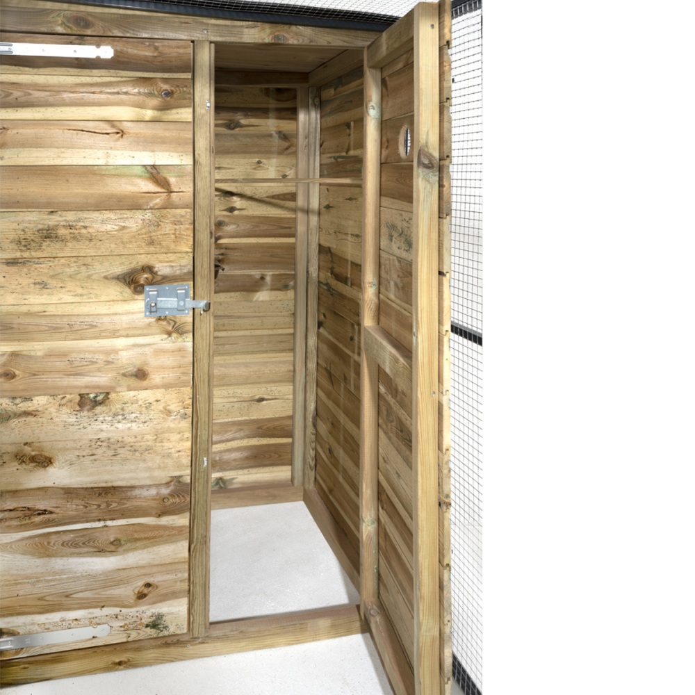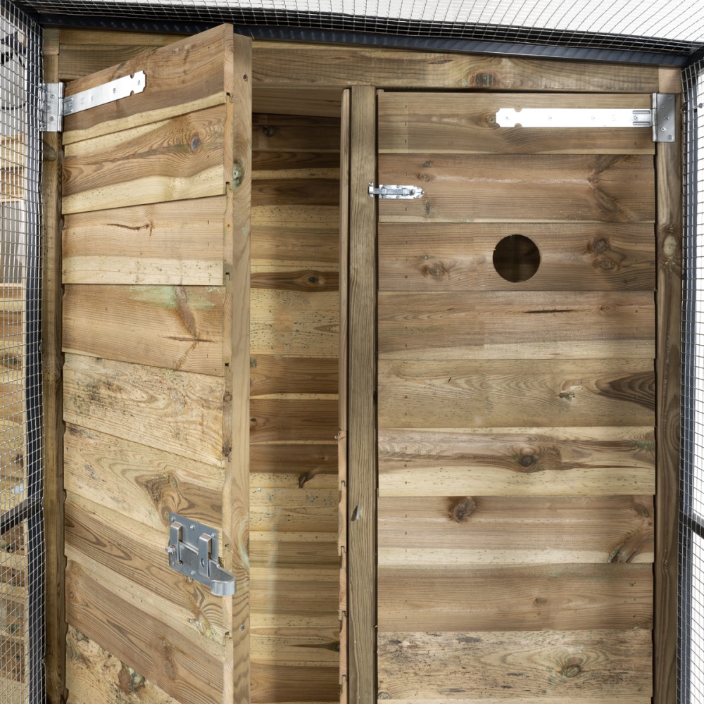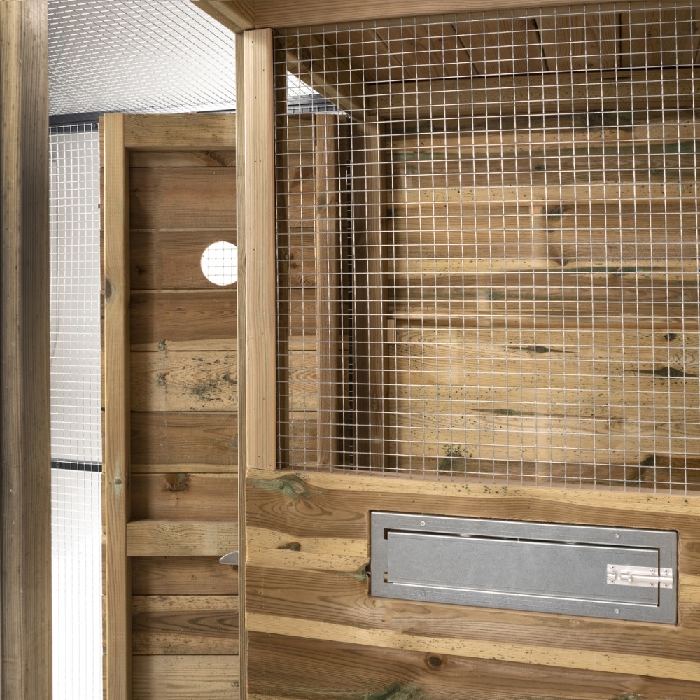 Bij dit model zit het nachthok met sluis aan de linkerkant (vanuit de voorkant bekeken). Handig als je de volière tegen een schutting of in een bepaalde hoek wilt plaatsen.