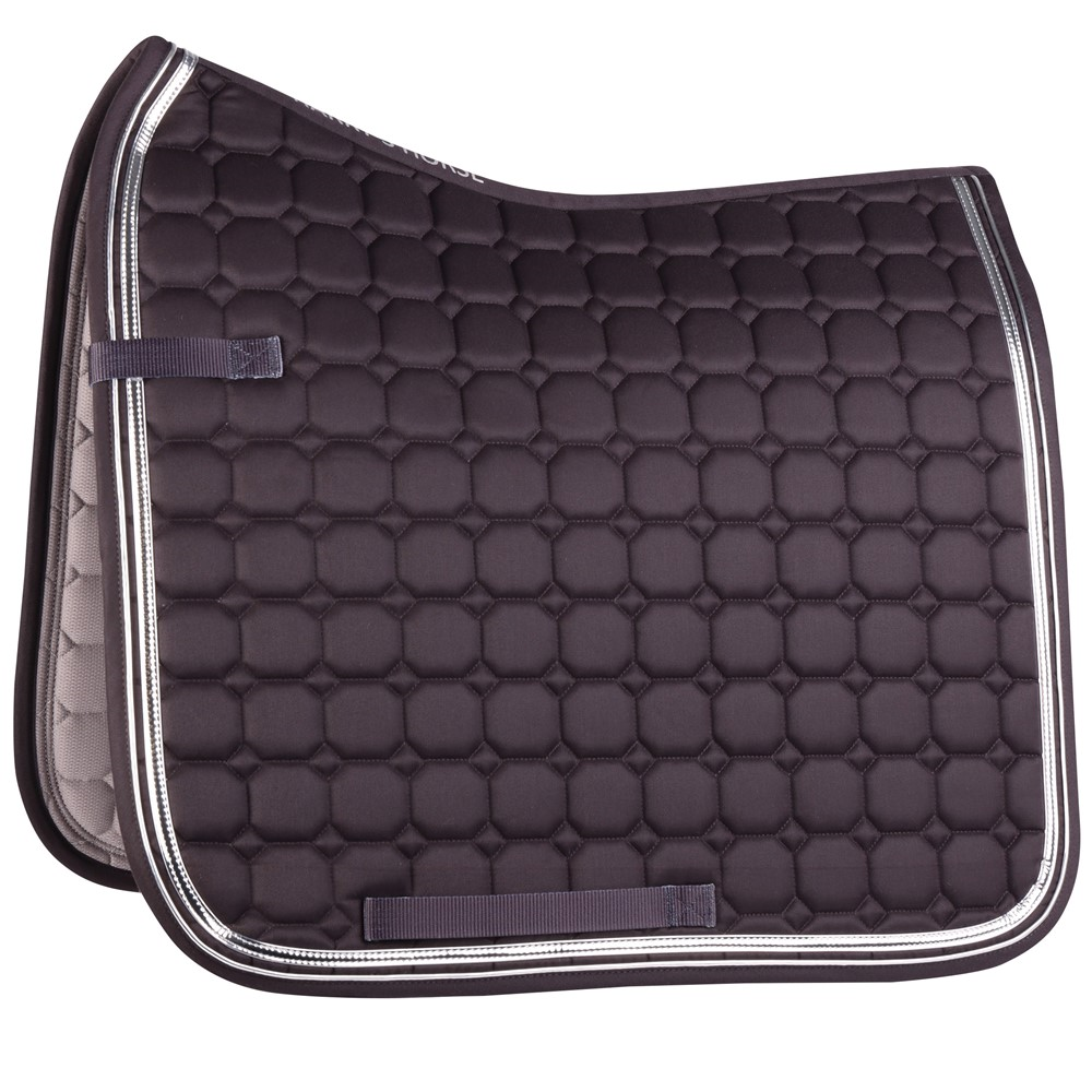 Zadeldek met een zilverkleurige piping en bies, de vulling bestaat uit 10mm PU foam en 250 gram polyfill. Het zadeldek heeft een quickdry voering voor optimale ventilatie en snelle afvoer van vocht en is voorzien van singel- en zadellussen.